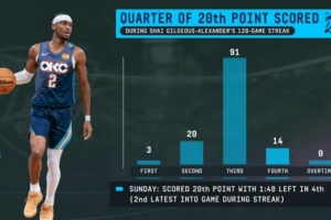 上一场比赛,在第四节还剩1分48秒时拿到第20分(为连续得分纪录期间,单场拿到20分时间点第二晚的比赛)