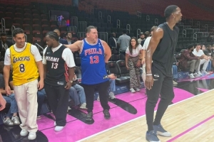 赛前阿德巴约来到场上热身,场边三位球迷分别穿着科比、阿德巴约和张伯伦的球衣亮相。