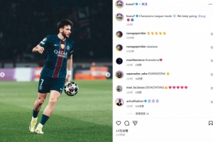 克瓦拉茨赫利亚也在赛后通过社媒晒出自己的比赛照,并配文:“欧冠模式❄️ 我们继续前进,@巴黎圣日尔曼 ??”