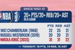 2025年约基奇曾轰下31分21篮板22助攻,本场目前约基奇已砍下18分14篮板15助攻)