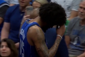 GIF-巴格利倒地时头撞到尤班克斯膝盖,回更衣室了