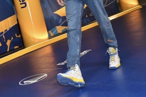 “他应该是从球鞋珍藏柜里拿出来的吧,”詹姆斯笑着说,“我记得他穿过那双,我不知道是不是他的新秀年。他是哪一年进联盟的,10-11年吗?好吧,是09-10年,所以那是詹姆斯10代吧,我记得他以前在比赛中穿过那双,我不确定他是不是有一双额外的,这双可能就是那双,他应该是从球鞋珍藏柜里拿出来的吧。”